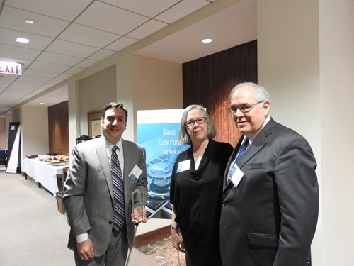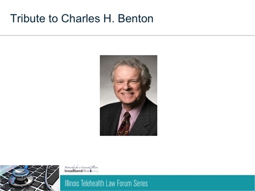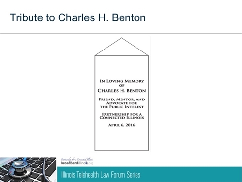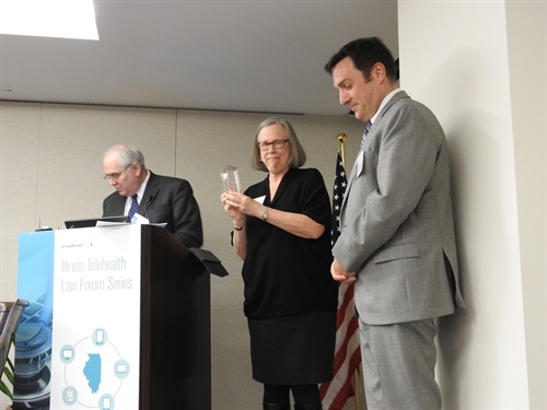 PCI Chairman Emeritus Charles Benton was honored posthumously at the inaugural Illinois Telehealth Initiative Telehealth Law Forum. Accepting the award was his daughter Adrianne Benton Furniss, Executive Director of Benton Foundation and Kip Roderick, Operations Director of Benton Foundation. PCI Treasurer Tony Licata of Taft Stettinius & Hollister presented the award.